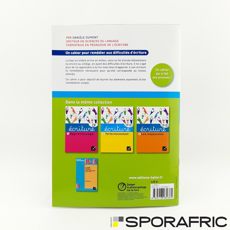 Lorsqu’un enfant arrive en milieu, voire en fin d’école élémentaire ou encore au collège en ayant des difficultés d’écriture, il ne s’agit plus de lui apprendre à écrire mais bien d’apporter à son écriture la remédiation nécessaire pour qu’elle corresponde au niveau attendu.<br />Ce cahier a pour objectif de fournir les éléments essentiels d'une remédiation simple et permet de travailler :<br />• le positionnement de la main et du poignet,<br />• la vivacité du geste qui crée les formes de l’écriture,<br />• la tenue de ligne et le respect des interlignes au-dessus de la ligne et en dessous,<br />• le point d’attaque et le sens de rotation des lettres rondes,<br />• la technique pour placer les points sur les i, les barres de t et les accents,<br />• les enchaînements délicats,<br />• la copie qu’on soit droitier ou gaucher.