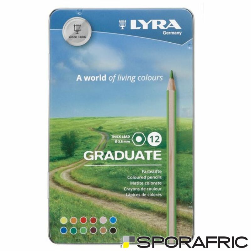 Crayons de couleur Lyra Graduate de haute qualité 12 pièces. Couleurs intenses avec une couverture élevée. Nez super résistant qui dure, avec un diamètre de 3,8 mm. Fait de bois de cèdre certifié PEFC. Facile à gratter.