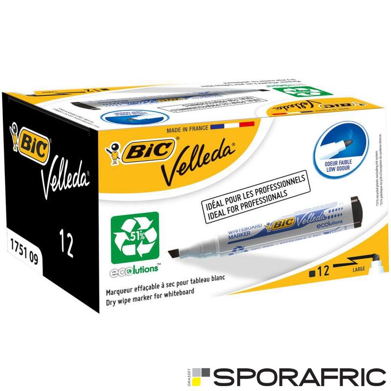 <div class="section__description"><span class="description__text">Idéal pour les professionnels, ces feutres effaçables à sec BIC Velleda 1751 sont disponibles dans 4 couleurs classiques et indémodables: noir, rouge, vert et bleu. Leur pointe biseautée permet de faire varier la largeur du trait entre 3, 7 et 5, 5 mm et est bloquée afin de résister à la pression sur les tableaux blancs. Ils sont fabriqués en France avec 51% de matière recyclées (à l'exception du système d'encre).<br /><br />Marqueur sans PVC<br /> Encre de cétone pour des couleurs vives et vives<br /> Fabriqué à 51% de matériaux recyclés<br /> Pointe inclinée<br /> Largeur de ligne de 3,7 à 5,5 mm<br /> Très facile à essuyer<br /> Corps en plastique<br /> Capot ventilé de la même couleur que l’encre<br /> Couleurs: Noir<br /> Boîte de 12 pcs.<br /></span> <div class="description__sellingpoints"> </div> </div>