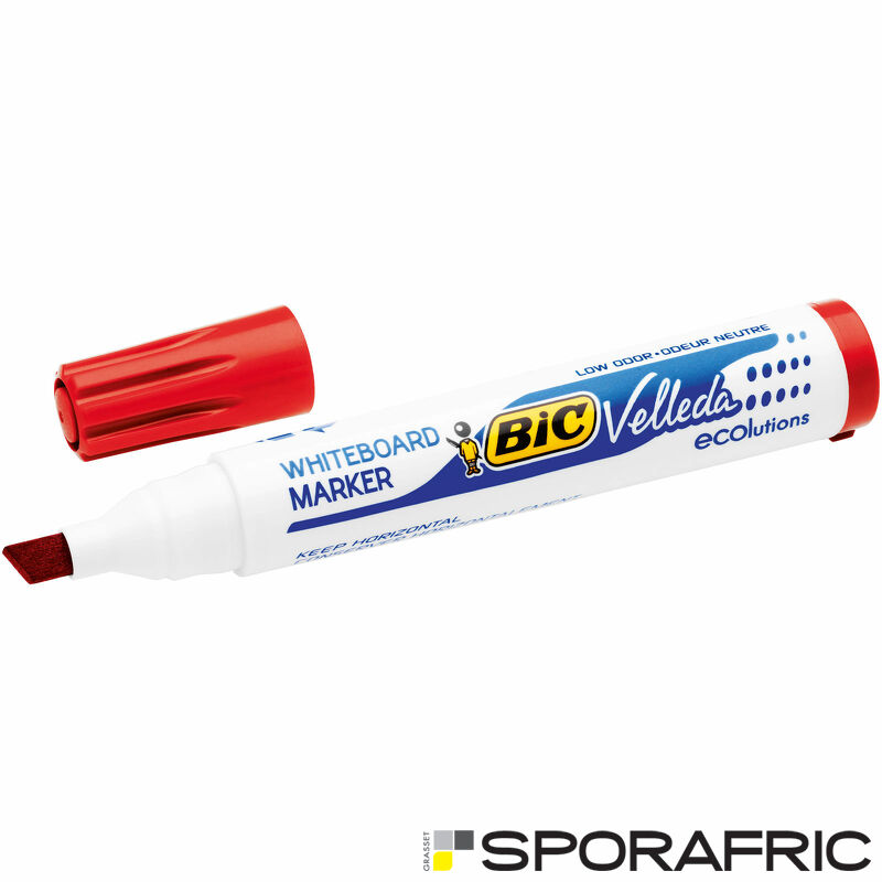 <span class="description__text">Idéal pour les professionnels, le feutre effaçable à sec BIC Velleda 1751 ECOlutions est disponible dans 4 couleurs classiques et indémodables: noir, rouge, vert et bleu. Sa pointe biseautée permet de faire varier la largeur du trait entre 3, 7 et 5, 5 mm et est bloquée afin de résister à la pression sur les tableaux blancs. Il est fabriqué en France à partir de 51% de matière recyclées (à l'exception du système d'encre).<br /><br /><br />Marqueur sans PVC<br /> Encre de cétone pour des couleurs vives et vives<br /> Fabriqué à 51% de matériaux recyclés<br /> Pointe inclinée<br /> Largeur de ligne de 3,7 à 5,5 mm<br /> Très facile à essuyer<br /> Corps en plastique<br /> Capot ventilé de la même couleur que l’encre<br /> Couleurs: Rouge<br /> Boîte de 12 pcs.<br /><br /></span>