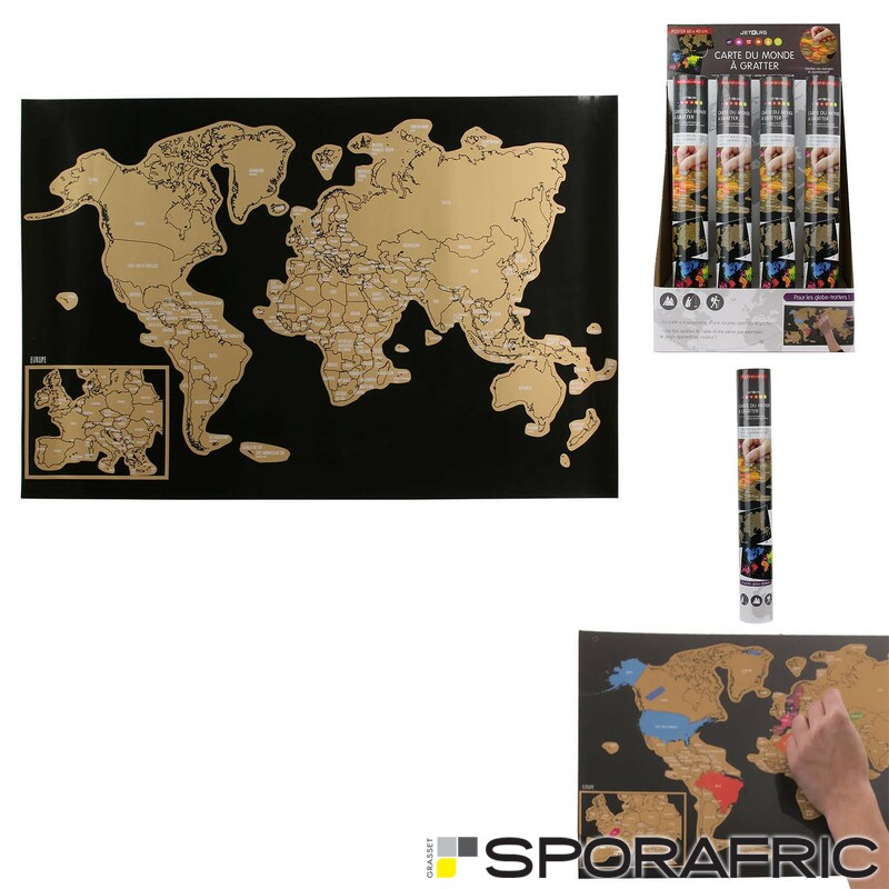 Carte du monde à gratterCommencez un voyage extraordinaire avec une carte du monde à gratter !A l'intérieur, vous trouverez une carte du monde, mais pas une carte simple, une carte qui vous permettra de découvrir ou redécouvrir les pays de notre planète.Vous avez probablement déjà deviné ce qu'on peut faire avec cette mappemonde à gratter. Prenez une pièce de monnaie dans la main et grattez les pays que vous avez déjà visités : Etats-unis, Brésil, Chine, Inde, Algérie et peut-être le Groënland ou les Philippines ?Bien sûr, rien ne vous empêche de gratter le pays de votre choix en fonction de vos propres goûts ou ceux que vous rêvez de visiter. Une manière amusante d'apprendre ou de réviser sa géographie.Un cadeau Fun et intelligent qui permet de découvrir le monde géographique d'une manière ludique et qui ravira les globe-trotters !