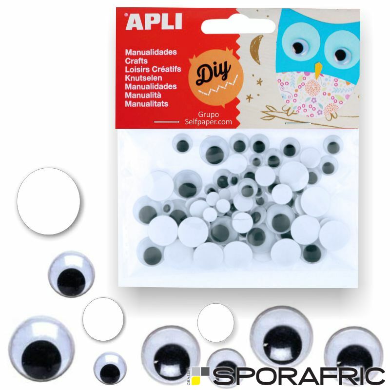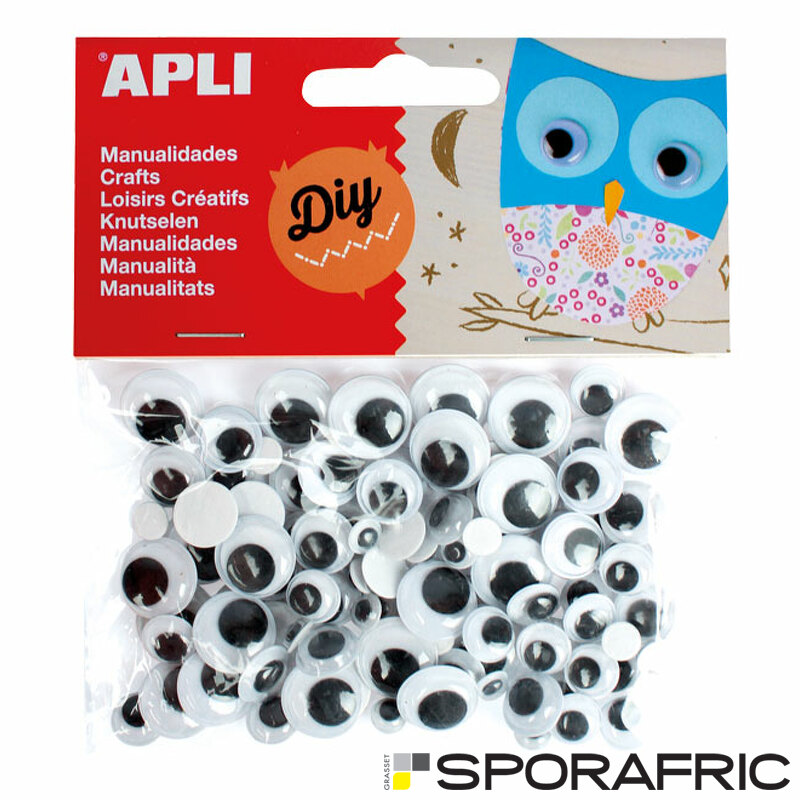 Yeux mobiles adhésifs noir et rond<br />Idéal pour réaliser des marionnettes, stimule l'imagination et la creativité<br />Parfait pour la maison et l'école