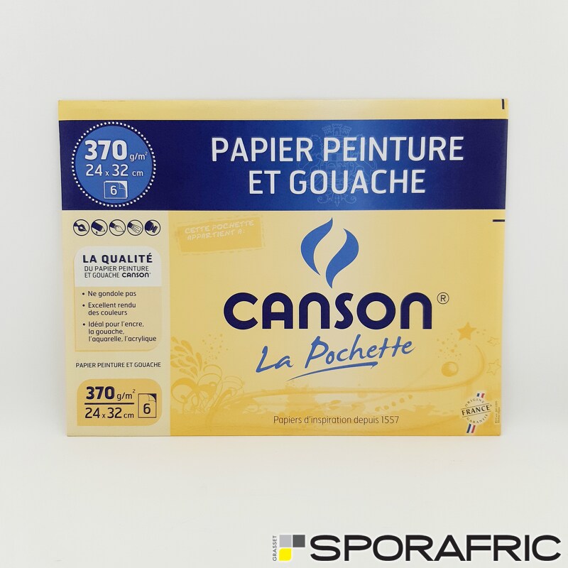 <div> <div class="mb-15"><strong> Pochette 6 feuilles de papier à dessin Canson, grammage 370g. </strong> Ce papier multi-technique est adapté au dessin et à la peinture. <br /><br />Son collage spécifique lui permet une juste absorption du liquide appliqué en surface. Il est tout autant adapté à la gouache qu'à l'aquarelle. <br /><br />Ce papier dispose d'une texture soyeuse, au touché satin. <br /><br />Le papier dessin peinture et gouache a une blancheur idéale favorisant un rendu harmonieux et renforçant le contraste des couleurs.<br /><br />Référence Canson 400065406.</div> Points forts : <div class="mb-15"> <ul> <li>Papier recyclé Canson fabriqué à base de récupération de papiers usagés de bureau</li> <li>Pâtes d'origine d'excellente qualité, leurs propriétés mécaniques sont proches de celles des pâtes vierges</li> <li>Papiers recyclés st re-pulpés dans un bain d'eau et filtrés pour les débarrasser des impuretés</li> <li>Papier recyclé Canson "100% recyclé", c'est-à-dire qu'il est composé à 100% de fibres cellulosiques recyclées</li> <li>Pâte naturellement blanche, et garantie ECF (garantie sans chlore)</li> </ul> </div> </div>